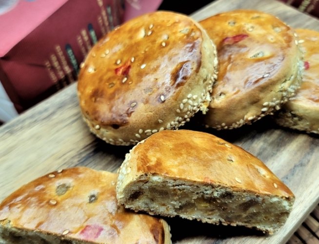 必買原因:這絕對是新竹糕餅的代表作!外表看起來就是個大餅,平平無奇?錯了!切開或咬下去,裡面滿滿的冬瓜糖、豬肉角、紅蔥頭,鹹甜交織還帶點油蔥酥的香氣,超級涮嘴。口感是那種有點酥又有點Q軟的,很特別。我第一次吃覺得味道有點奇妙,結果越吃越上癮(真的!)。老人家特別愛這一味,送長輩首選。據說是吳家祖傳手藝,百年老店有它的道理。這絕對是新竹伴手禮推薦名單裡不可或缺的傳統味。